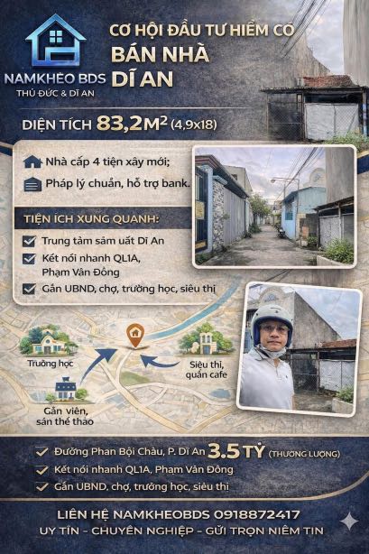 Đừng mua nhà hãy mua “VỊ TRÍ” ở Dĩ An! 83,2m² (4,9x18), nhà cấp 4 tiện xây mới: giữ đất giữ tiền, nâng cấp là tăng giá. Khu sầm uất Dĩ An, chạy ra QL1A Phạm Văn Đồng rất nhanh, xung quanh đủ UBND ,chợ ,trường ,siêu thị và công viên Giá 3,5 tỷ (thương lượng) hàng hiếm tầm này không có nhiều. ???? Inbox 0918 872 417 để lấy vị trí & xem nhà.